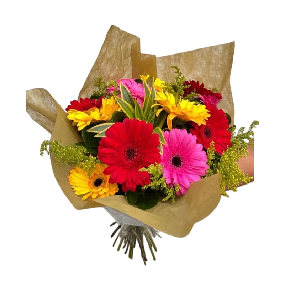Es una de las formas más bonitas para expresar tus sentimientos y sorprender a esa persona que tanto quieres, buque de flores elaborado con 12 gerberas, follajes verdes, lindos papel coreano y hermoso moño en cinta de papel