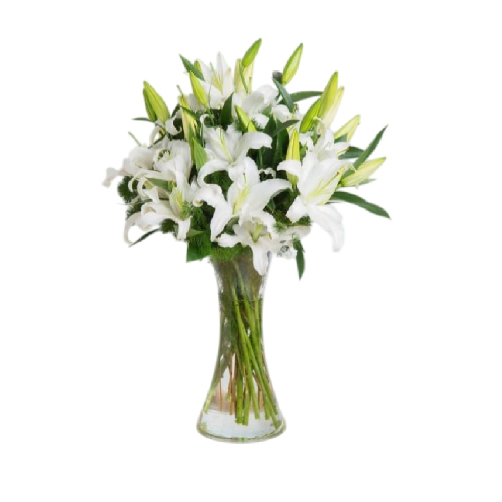Agregar un toque de elegancia y frescura con un diseño floral elaborado en jarron de vidrio con lirios del japón blancos y follajes verdes