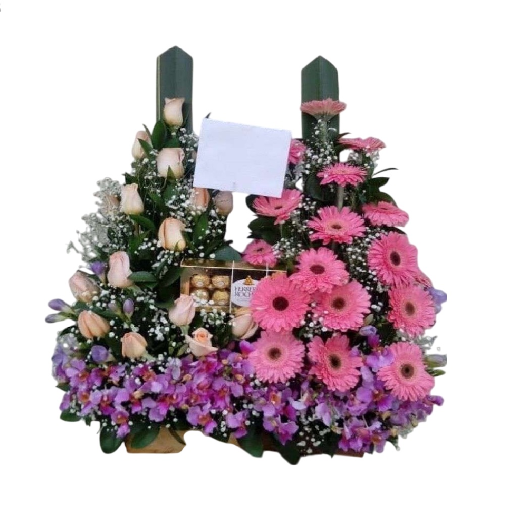 En un ramo encontramos colores, formas y texturas, donde se combinan para crear una composición artística. regala este hermoso diseño floral dos en uno, elaborado en base de madera, con 12 rosas rosadas, 12 gerberas, orquidea, hoja de lino, follajes verdes y chocolates